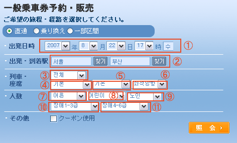 ① 鉄道を利用する年月日、大体の時間を選択します。 一番右に出ているハングルは曜日で、日付を選ぶと自動で出ます。