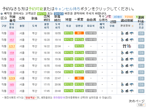 韓国鉄道公社(KORAIL)のウェブ時刻表は現在、韓国語と英語があります。 韓国語:http://www.korail.com/ 英語:http://www.korail.com/en/pr/pr21100/w_pr21110.jsp 韓国語ページを開くと左側に時刻表検索があります。 これを簡単に訳すとこうなります。