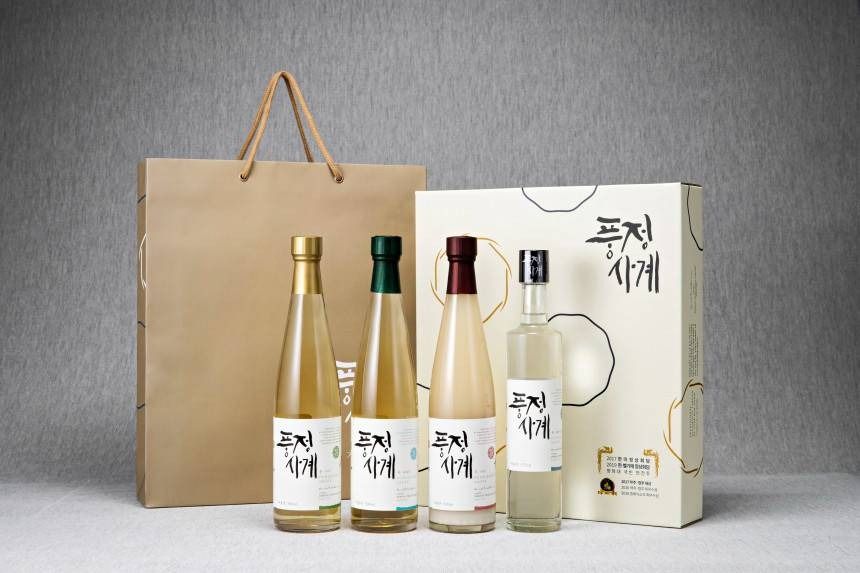プンジョンサギェ(楓井四季)チョンジュ(清州)産の米と手作りの麹を用いて四季それぞれの味わいを楽しめるプレミアム伝統酒です。春(清酒)、夏(過夏酒)、秋(濁酒)、冬(蒸留焼酎)の4種類がそろっています。中でも「プンジョンサギェ(楓井四季)・春」は、2017年の米韓首脳会談の晩餐酒に選ばれたほか、「2021大韓民国伝統酒品評会」では薬酒・清酒部門で最高賞である大統領賞を受賞しました。
