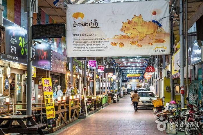 ソムン(西門)市場は、チョンジュ(清州)の歴史と食を同時に体験できる伝統市場です。市場の一角にある「サムギョプサル通り」では、醤油ダレを塗って焼いた、臭みのないサムギョプサルにピリッと酸味の効いたパジョリ(細切りねぎの辛味和え)を添えて食べる、チョンジュ(清州)ならではのサムギョプサルを堪能できます。