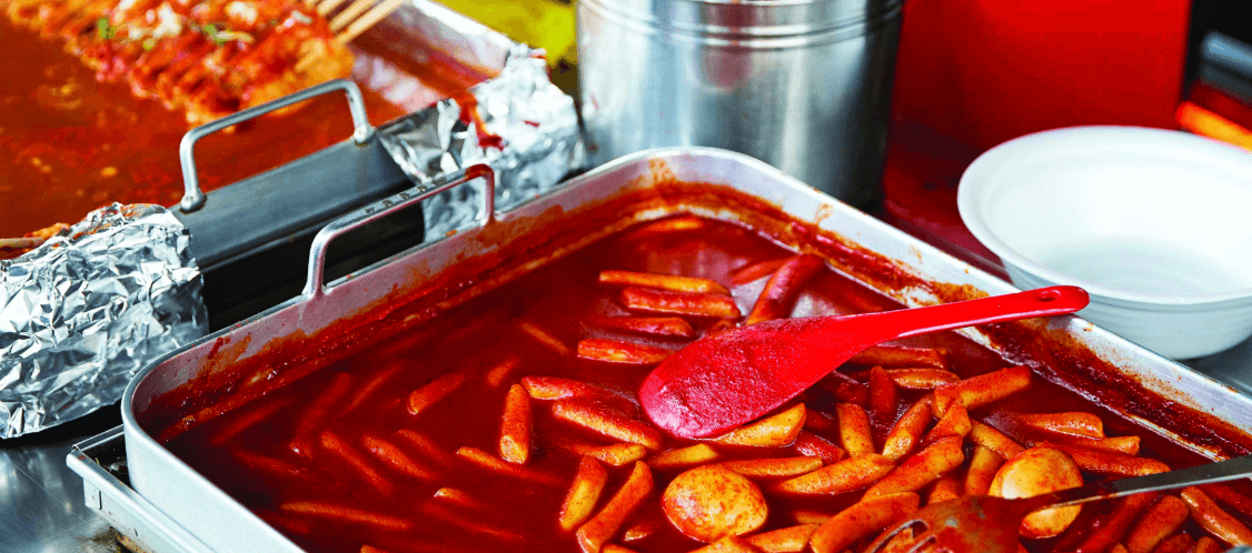 チェチョン(堤川)で有名なパルガンオデンは、辛いソースで煮込んだ串刺し練り天が味わえるお店です。トッポッキや天ぷらなど、赤い練り天と一緒に食べられるメニューも色々とあります。