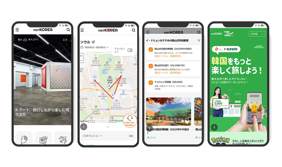 2019年にはそれまで各言語ごと別々のアプリだったものを統合、設定の切替だけで日・英・中3か国語(中国語は簡体字サービス)を自由に変えられる統合アプリを開発、そして今回2023年、韓国を訪れる方の嗜好に合わせ観光情報を提供する、韓国観光公社外国語サービスVISITKOREAの韓国観光統合プラットフォーム化に伴い、モバイルアプリについてもホームページとともにリニューアル、ホームページとアプリのコンテンツが連動するサービスを開始しました。