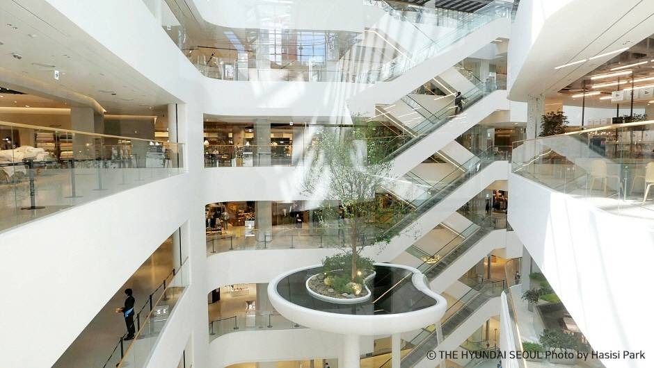 グローバルトレンドとなっているKコンテンツの中核・ソウル、さらにその中心にモダンなフラッグシップストア「ザ現代ソウル」が建っています。「ザ現代ソウル」は、「未来に向けた響き」というスローガンの下、より幸せな明日のためのビジョンと新しい暮らしの基準を提示しています。革新的な空間設計、グローバルなコンテンツ・キュレーション、そして未来型テクノロジーなど、ザ現代ソウルは、ソウル最大規模の「ニューグローバルランドマーク」となっています。新しい素材との出会い、面と線のバランス、そして光に満ちた革新的な内部設計。ザ現代ソウルでは、世界のインテリアや建築のデザインの流れを見通すことができます。ザ現代ソウルに入るとすぐ、サウンド・フォレストとウォーターフォールガーデンが目の前に現れます。未来を見据えて設計されたハイテク建築物で出会う意外な自然は、驚くほど美しく感じられます。約1000坪の大規模な屋内庭園と天然芝、約20メートルの高いガラスの天井から降り注ぐ自然光は、森の響きをそのまま伝えます。芸術は、言葉にしなくても感じ取り、共感できる最高の言語です。180坪の立体的な展示は、入った瞬間、インスピレーションを大いに刺激します。暮らしの中でインスピレーションを与え、より上質な文化を享受するためのコミュニケーションが、ここから始まります。Unite & Shine、STUDIO SWINE、 自然からのメッセージが伝わるデザインと、それを楽しみ、感じ取る観客によって完成するStudio Swineのアートワークが、Exclusive Label(1F)フロアでハイエンドブランドと融合しています。