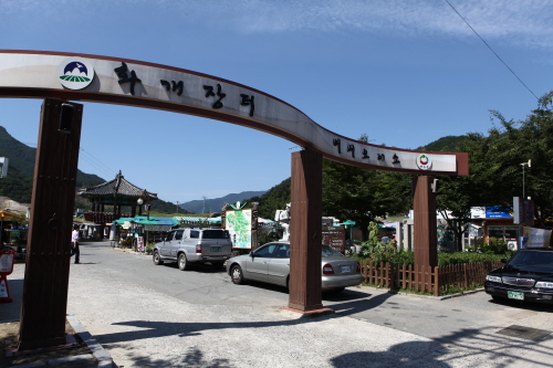 花開市場(ファゲジャント)は韓国の五大市場のひとつで、全国のどの市場より多くの人が集まる場所です。作家・金東里(キム・トンニ)の小説「駅馬」の舞台でもある花開市場は、市場から桜並木に沿って上ったところにある智異山(チリサン)の双磎寺(サンゲサ)とともに、多くの観光客がやって来る場所です。また、クッパ、トトリムク(ドングリの実で作ったぜリー)、シジミ汁を出す食堂や、飲み屋、飴売りなどの特産品を扱う店のほか、鎌などの伝統農業器具や包丁などを即売しているお店も並んでいます。