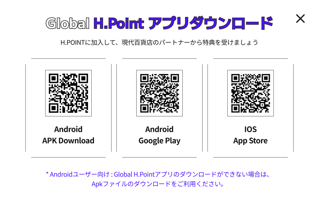 - Global H.Pointアプリのダウンロードができない場合は、Apkファイルのダウンロードをご利用ください。