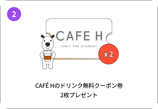 - 各店の「CAFE-H」でAPP内のクーポンをご提示くださった方にCAFE Hドリンク無料クーポンを差し上げます。