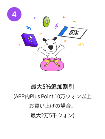 - Plus Pointは単一ブランドを10万ウォン以上お買い上げの際、最大2万5千ウォンまで割引が受けられます。