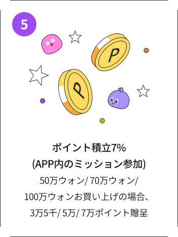- MISSION7%は50万ウォン/70万ウォン/100万ウォン~最大1億ウォンまで積立可能で、各金額別に7%の定額で贈呈されます。