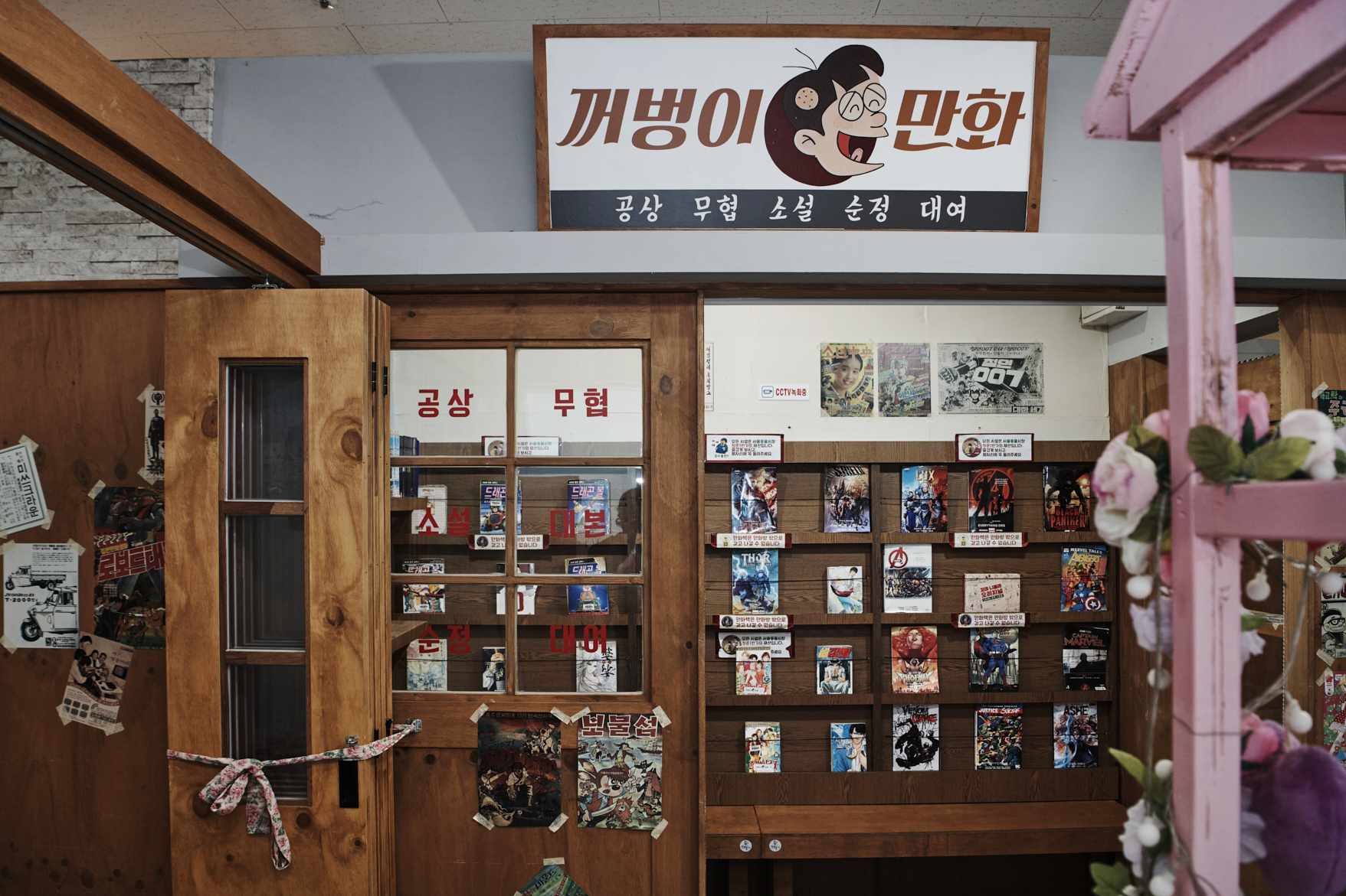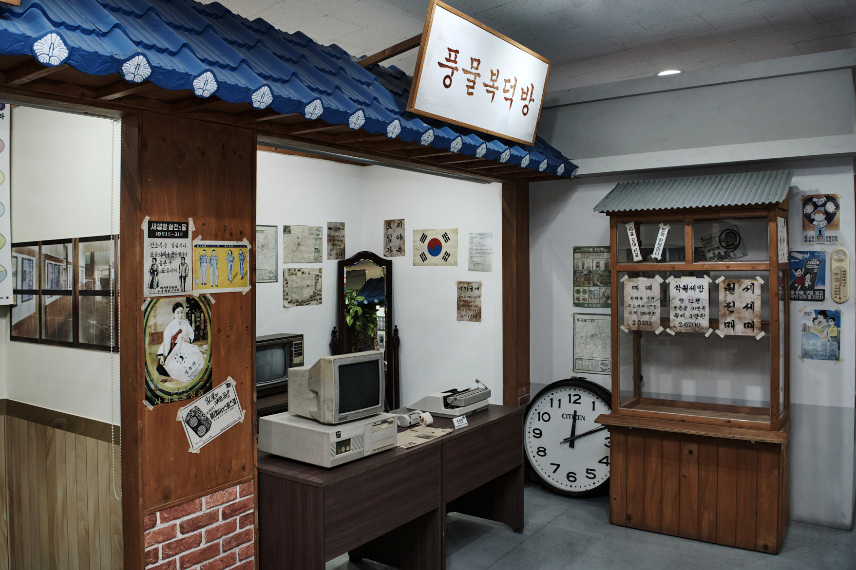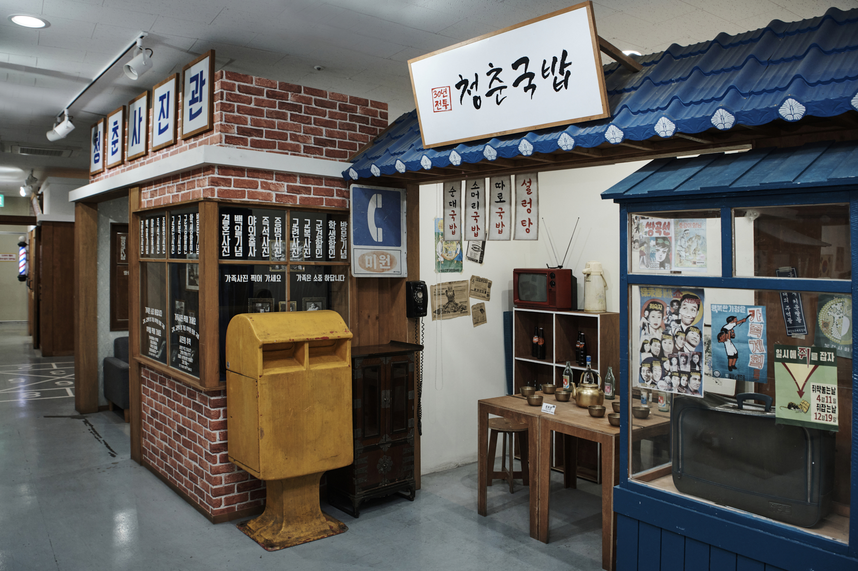 階段から2階に上がると60~70年代、ソウル市内の商店街を再現した「青春一番街」が現れます。実際経験したことがない人でも、どこかで見たような馴染のある風景です。色褪せたコミックスやLP、テレビのような大きさの386コンピューター、文房具屋の前にあったミニゲーム機、赤い皮シートのソファーがある喫茶店など、昔の思い出が蘇ります。青春写真館で教練服を着て少し不良っぽいポーズで写真を撮ってみたり、古いLPをターンテーブルにかけてみたりするのもいいでしょう。ここは博物館のようなところで、過去へのタイムスリップが楽しめます。