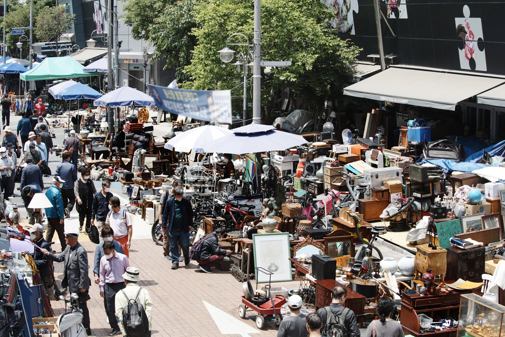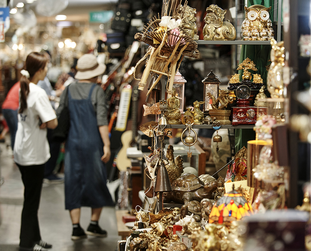 のみのように全国をあちこち飛び回って古くて珍しい品物を集めてくる商人にちなんで「蚤の市」と呼ばれていたファンハク(黄鶴)洞の露店商が、近・現代を経てシンソル(新設)洞に定着したところがソウル風物市場です。「ないものはない」と言われるところで、多くの品物が並んでおり、ソウルプンムル(風物)市場の入口にある横断幕のところから大勢の人々で賑わっています。ずらりと並んだ露店には古いパイプから旧型カメラまで、あらゆるものが観光客の興味を刺激します。