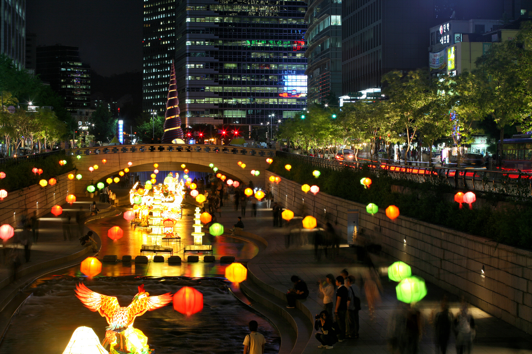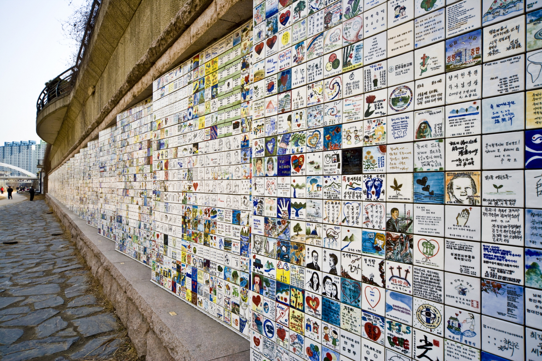 地下鉄からソウル風物市場に進み、そのままさらに進んでいくと清渓川に到着します。清渓川の復元を記念して、2万人の市民たちの願いをタイルに刻んで飾った願いの壁が目の前に現れます。右側に行くとチョンノ(鐘路)を通って清渓川広場まで幅広く見て歩くことができ、左側に行くと、短い区間ではありますがトゥムル橋、プロポーズの壁、板小屋テーマゾーンなどの見どころが充実しています。きれいな夜景を観賞しながら、バス停3つ~4つほどの区間をゆっくりと歩いてみるのもいいでしょう。