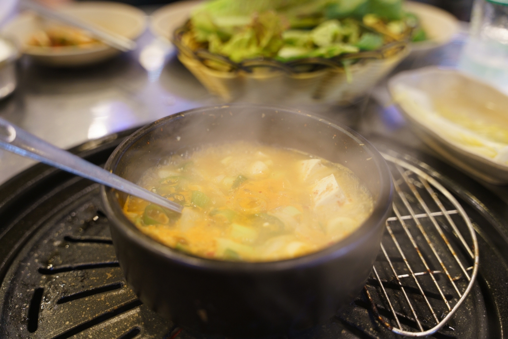 ぐつぐつと土鍋で煮るキムチチゲ、テンジャンチゲ、スンドゥブチゲは韓国人のソウルフード。チゲにほかほか炊き立てのご飯と美味しいおかずがあれば、スタンダードな韓国人の食膳になります。パルガン(赤)棟の2階の奥にある定食屋で、5~6千ウォンほどで幸せを味わってみてください。
