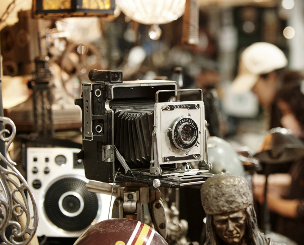 露店を通り過ぎてビルの中に入ると、色分けされた空間があり、スムーズにショッピングができます。ノラン(黄色)棟は生活雑貨、チュファン(オレンジ色)棟はヴィンテージ衣類、チョロク(緑色)棟は骨董品を主に扱っており、パラン(青色)棟は衣類、ナムセク(紺色)棟には生活雑貨、ポラ(紫色)棟は趣味生活関連アイテムなどが集まっています。どのゾーンに行っても天井まである高い収納棚に、ノートパソコンやタイプライター、電話、ヴィンテージな食器、煌びやかな箪笥、アンティークな家具などがぎっしりと並べられており、この小さい空間に詰め込まれた人間の歴史に感嘆してしまいます。