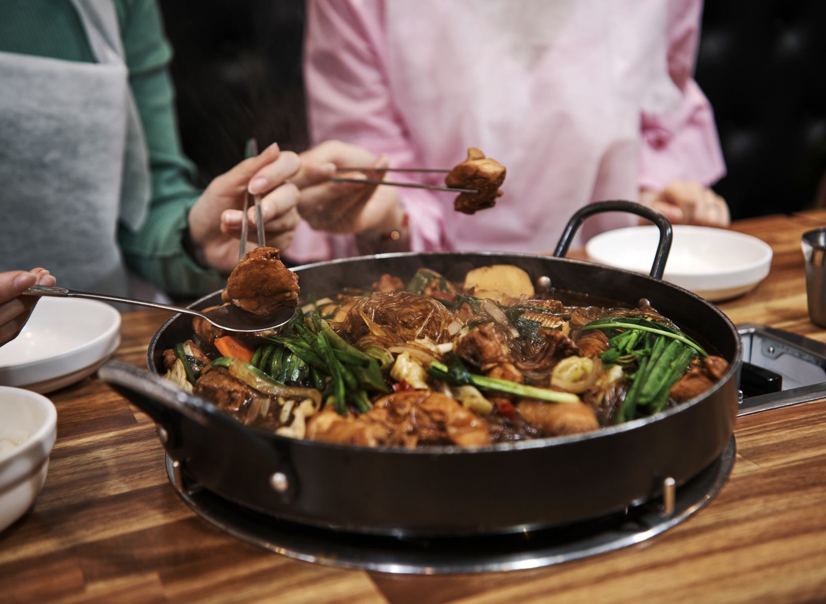 安東チムダクの由来にはいくつかの説がありますが、一番有力なのは洋風フライドチキンに危機感を感じた安東旧市場の鶏通りの商人たちが開発したフュージョン料理だというものです。油気が少なく、さっぱりとした鶏肉にピリ辛のタレと各種野菜が合わさり、味も栄養も優れています。