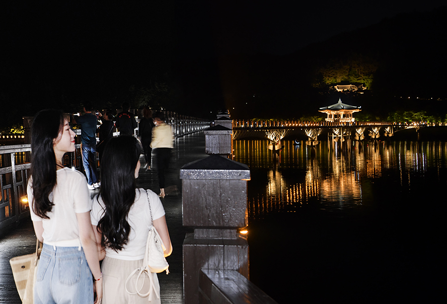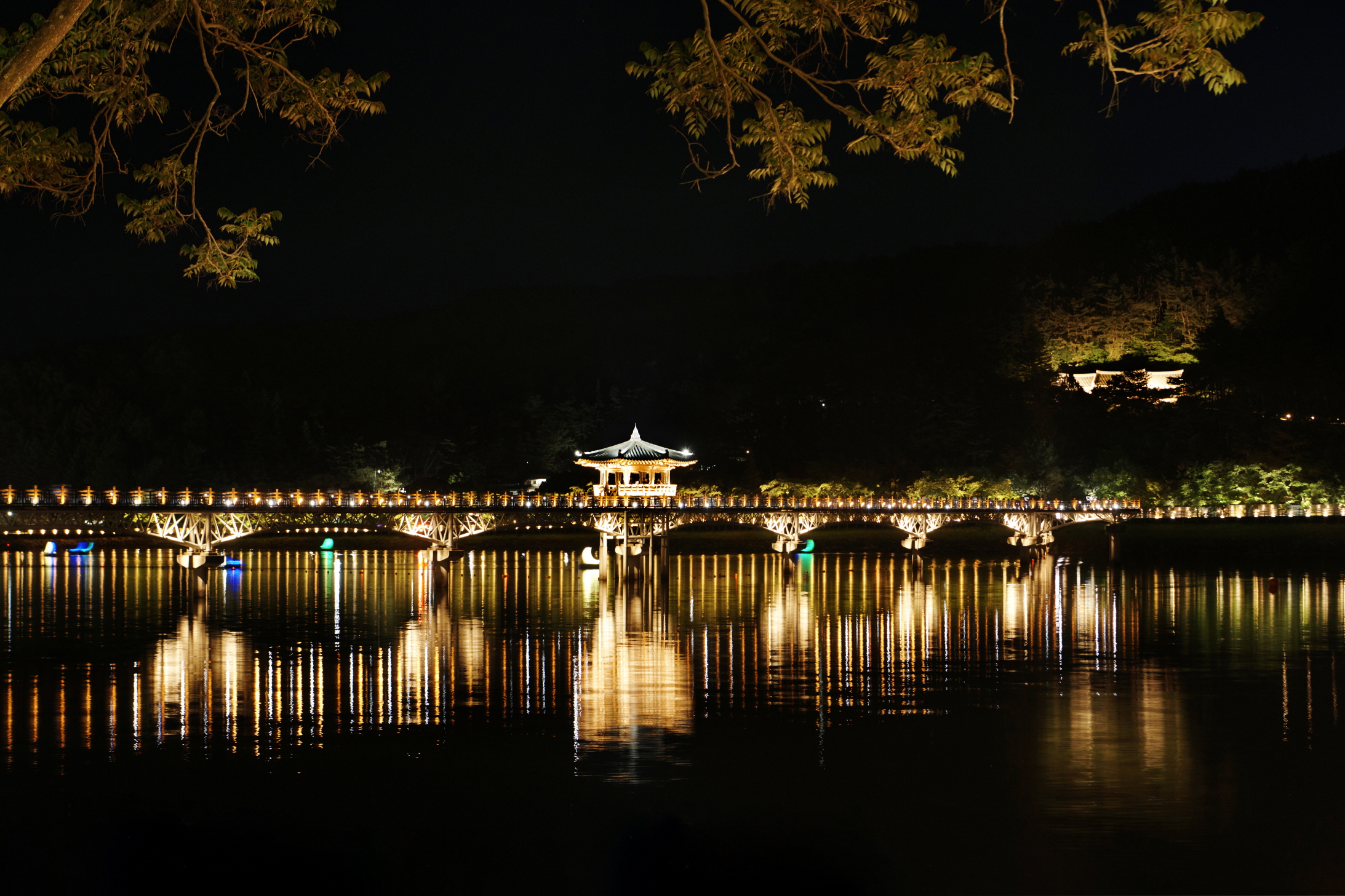 先立った夫を偲び、髪の毛を抜いて履物を作ったというある夫婦の美しくて崇高な愛物語が伝わる橋。全長387メートル、幅3.6メートルのこの橋は韓国で一番長い木の人道橋です。橋を渡って川の真ん中にある月映亭まで行くと、洛東江の美景が目に入ります。夜景が美しいのでデートコースとしても有名で、ムーンボートにも乗ってみるのもおすすめです。三日月の形をしたオブジェがついているボートを自分で漕いで月映橋まで行って戻ってくるシンプルなコースですが、カップルで雰囲気のある曲を携帯スピーカーで聞きながらボートに乗ると、きっと素敵な時間が過ごせるはずです。