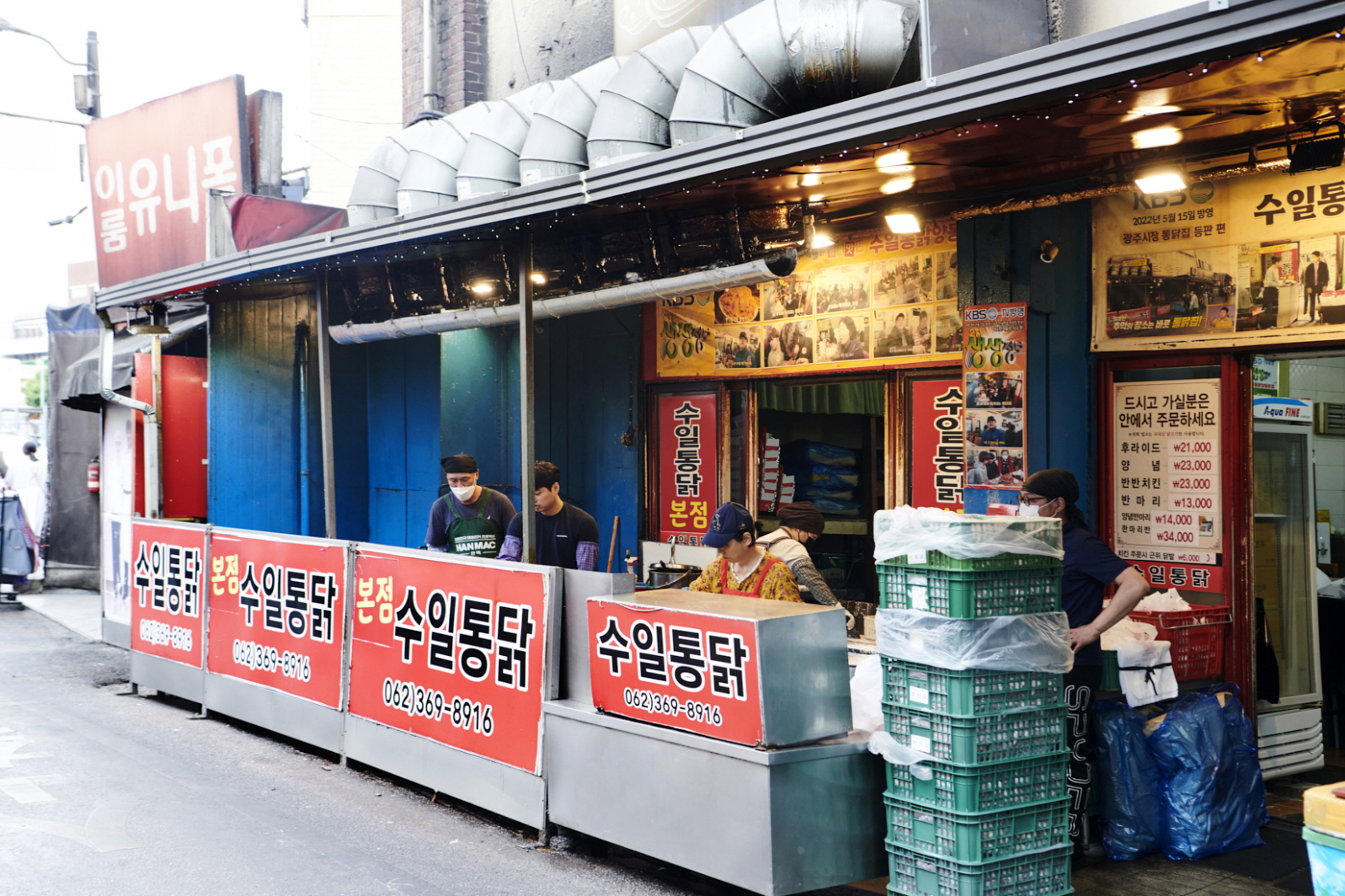 ヤンドン(良洞)伝統市場のチキン通りの2大名店。スイルチキンは少しサクッとした歯ごたえで、ヤンドンチキンはややしっとりとして柔らかい方です。両店とも量が多く、おいしさで評判となり、それぞれに多くのファンがいます。光州起亜チャンピオンズフィールドのホームゲームが行われる日には、チキンのお持ち帰りの長い列ができます。