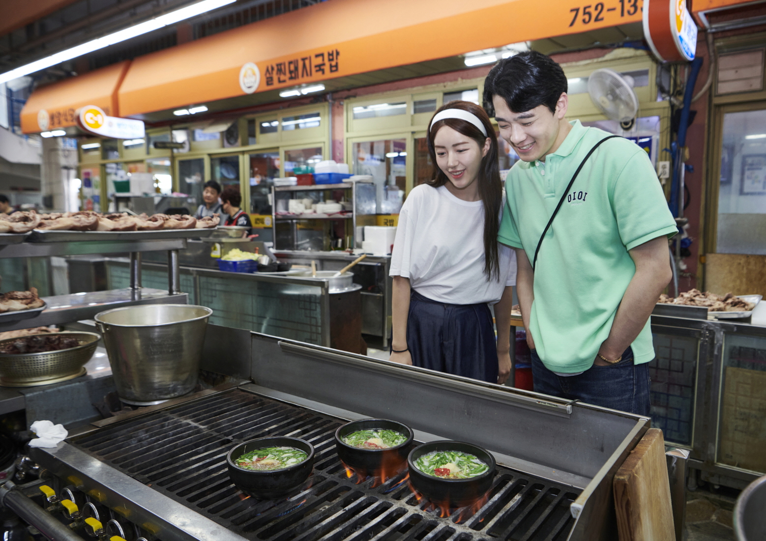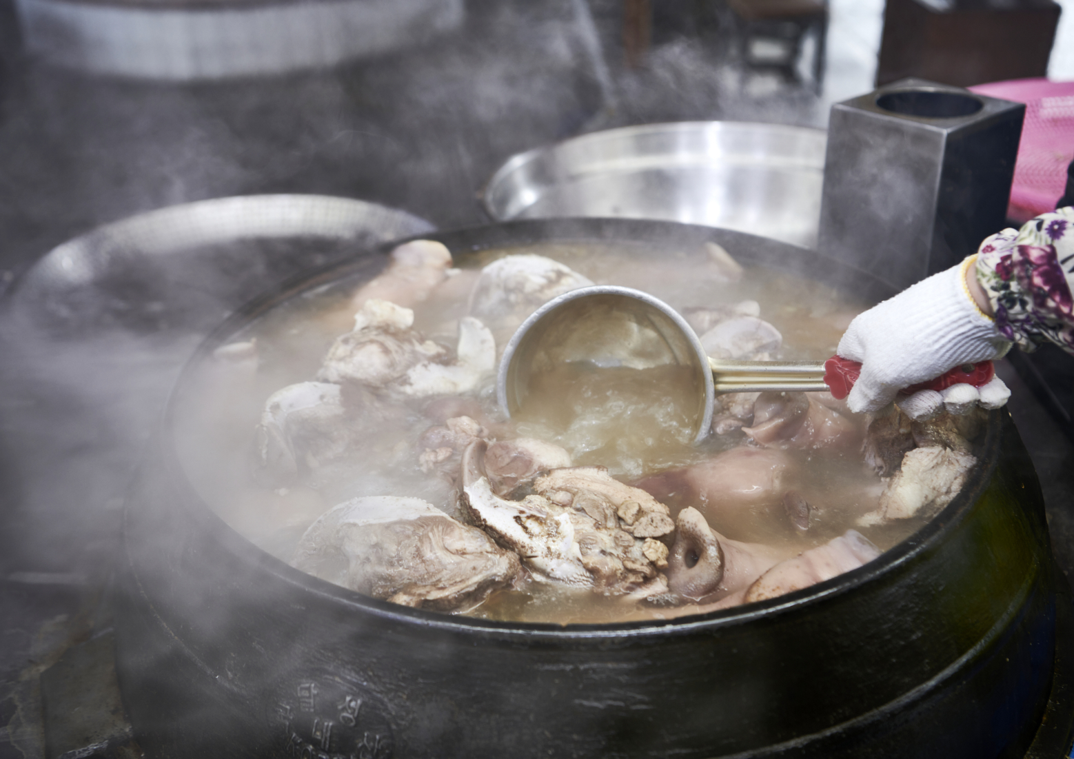 人がたくさん集まる場所だけに、腹ごしらえのための料理もたくさんあります。順天ウッチャンを代表するご当地グルメは何と言っても「全国飲食テーマ通り200選」に選ばれた豚肉クッパ。クッパ2人前を注文するとまず前菜としてスユク(茹で肉)を一皿出してくれます。さっと茹でただけのシャキシャキ感の残るニラに、スユクをくるっと巻いてアミの塩辛にちょっとだけ付けて食べ、地酒のイプセ酒(カエデの樹液入り焼酎)を一口飲むと最高の気分が味わえます。頭部肉だけを煮込んでスープを作るため、豚肉クッパはくせがなく濃厚で、二日酔いも一気に吹き飛びます。大きめに切ったカクトゥギや全羅南道ならではのコクのあるキムチを土鍋に入れ、ピリ辛な味を楽しむのもいいでしょう。毎年9月8日に開催される順天ウッチャンクッパ祭りにも、2012年に始まって以来、毎年多くの人々が訪れています。