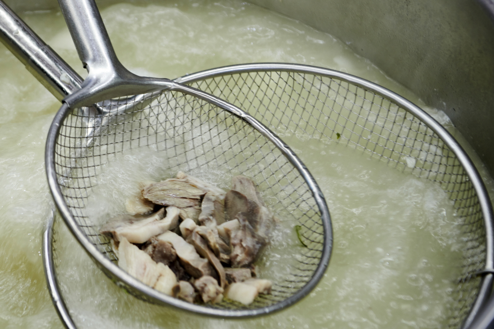 ホルモン(腸や内臓)ではなく豚の頭肉をじっくりと煮込んだまろやかな味のスープと、脂っこさを消してくれる豆もやしをたっぷり入れ、地元の人々や観光客を満足させてくれる順天ウッチャンの名物。2人分注文するとまずニラとスンデ付きのスユク(茹で肉)が一皿出てきます。スユクは無料サービスです。