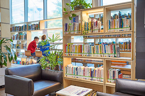 図書館の中央には「アートプロジェクト」の一環として季節ごとに入れ替えが行われる大型アート作品、E-BOOKコーナー、各種文化行事などが開かれるブックラウンジなどがあります。