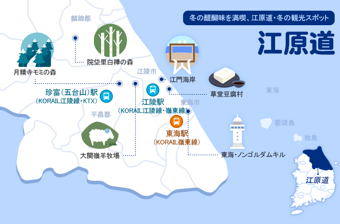 韓国でも山間部が多く占める江原(カンウォン)特別自治道は、他の地方では味わえないとびっきりの韓国の冬が感じられるエリア。記憶にもまだ新しい2018平昌冬季オリンピックが開催された地として一躍有名になった江原特別自治道ですが、それだけではありません。 冬の冷たい風が頬をなで、その寒さの中で体験した人だけが実感する冬の醍醐味がいっぱいのエリア、そう、ここ江原特別自治道です。