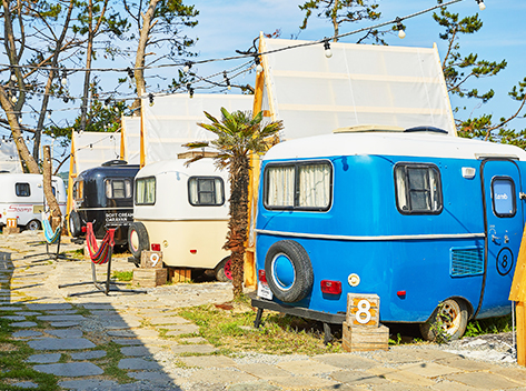 またキャンプがお好きな方にはWAVEON COFFEEのすぐ東横にあるキャンピングカーゾーン「THE MOVING」がおすすめします。こじんまりとしてかわいいキャンピングカーが数多くあり、お気に入りのキャンピングカーで一夜を過ごしてみましょう。個性的でかわいらしい外観からSNS映えすると人気を博しているホットスポットです。