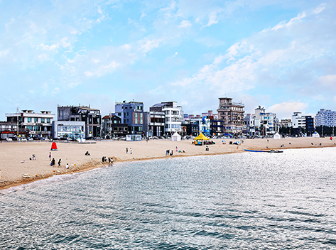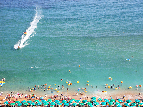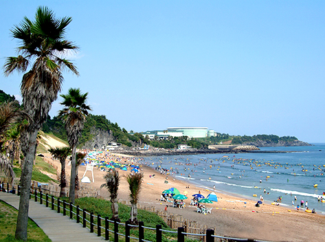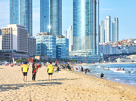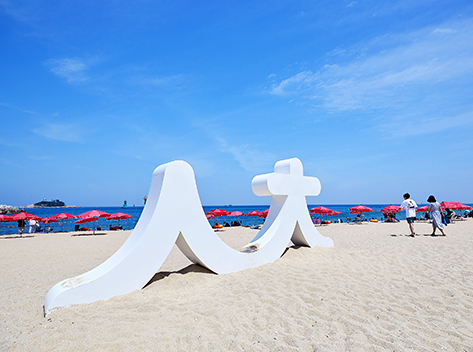 海雲台(ヘウンデ)海水浴場は釜山を代表する海水浴場で、韓国でも一二を争うほどの人気のビーチ。夏になると外国人の方々も数多く訪れ、まさしく国際観光都市・釜山にふさわしい海水浴場です。海雲台海水浴場は遠浅で波が静かなことから海水浴にはうってつけの砂浜です。海辺に建つ超高層ビルと白い砂浜があいまって素晴らしい海辺の風景となっているのがここ海雲台海水浴場です。