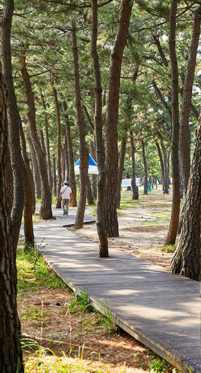 鏡浦海岸は江原(カンウォン)特別自治道江陵市(カンヌンシ)雁峴洞(アニョンドン)にある海辺。 鏡浦海岸の背後には松林があり、素晴らしい風景の海岸です。松林の中を縫うようにある遊歩道を歩いていると、どこからともなくほのかな松葉の香りが漂ってきて爽快な気分になれます。また車でお越しの方には風光明媚な松林沿いの道路をドライブするのもおすすめです。