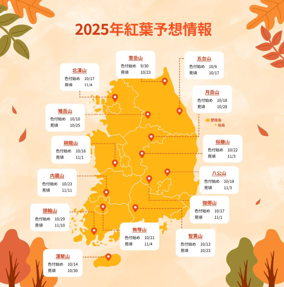 9月に入り夏の暑さが収まりつつある韓国。気温が下がるにつれ、山々の木々が美しく色付きはじめる季節が近づいてきました。2025年の韓国の紅葉は、9月30日頃に雪岳山から始まり、智異山は10月13日頃、漢拏山は10月17日頃から色付き始める見込みです。紅葉の見頃は色付き始めからおよそ2週間後とされ、10月中旬から11月初旬にかけて全国的に見頃を迎える予想となっています。