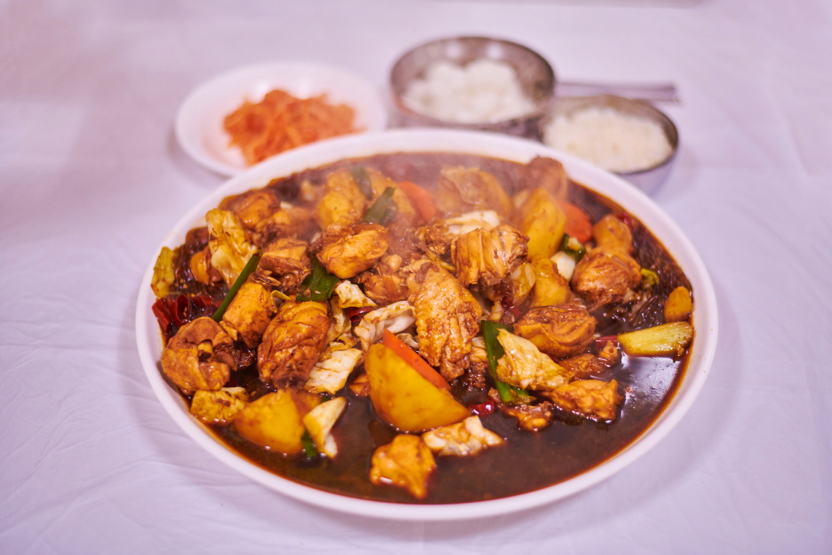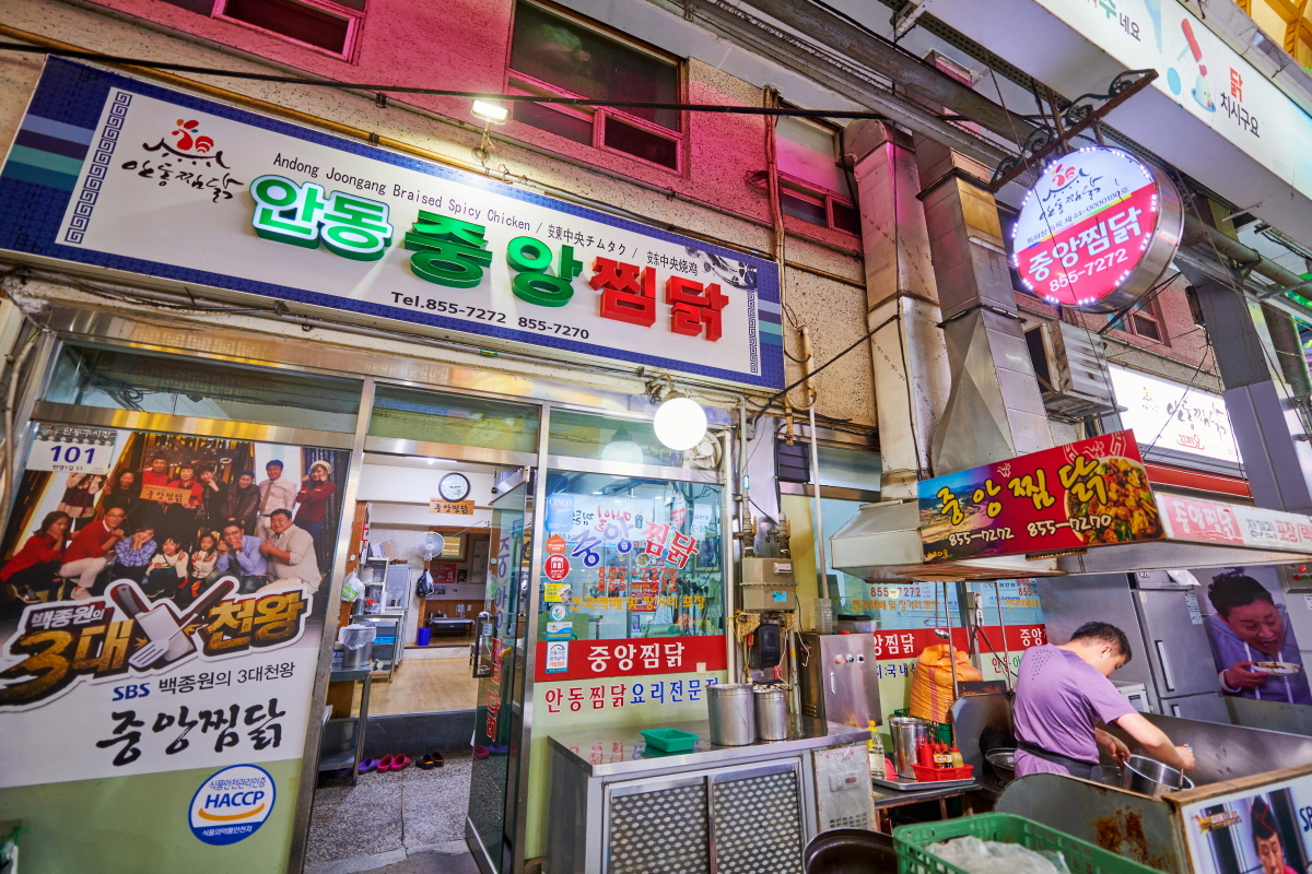 チムダクが名物であるだけに、安東にはチムダク屋通りがあります。たくさんあるお店の中でも、安東中央(チュンアン)チムダクはバラエティ番組『ペク・ジョンウォンの三大天王』に登場、最高の味と認められ、いつも行列ができているお店です。たれがたっぷりの定番チムダクですが、甘みのある醤油の味がきいた味わいがクセになります。たれがよくからんだサツマイモなどのでんぷんで作った麺・タンミョンは時間が経ってもあまりのびることはなく、最後の一口まで弾力のある食感が味わえ、とても美味しく食べられます。締めは残ったたれにご飯を入れて焼飯にするとお腹いっぱいになりますのでお試しあれ。