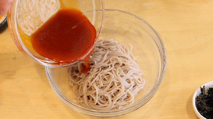 (3)冷やしたそばに(1)のソースをかけて混ぜる。