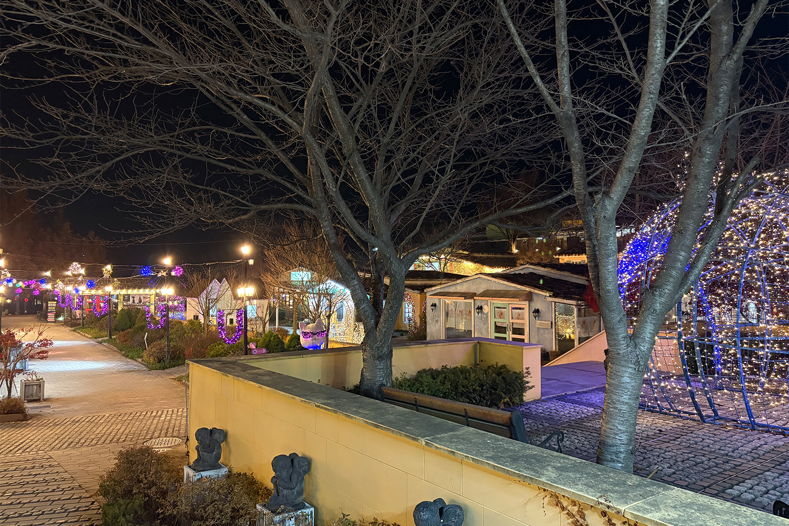 日が暮れてライトが灯り始めると、村全体が一気に温かくロマンチックな光に包まれたんだ。
