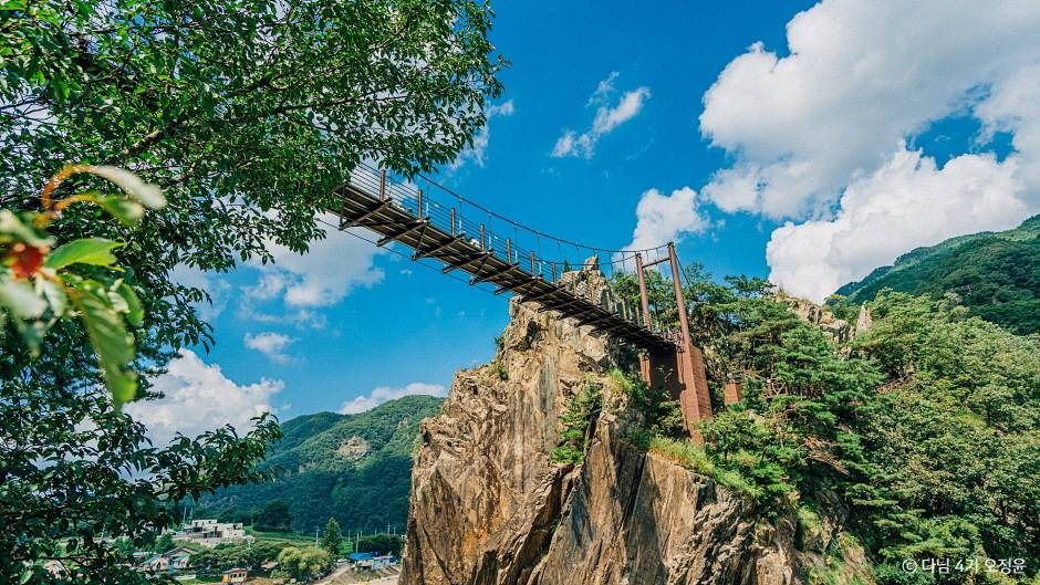 長い歳月をかけて川の流れが岩を削ってつくった忠州の代表的な自然名所、遠くから見れば峰が川の上に浮かんでいるように見えることが名前の由来となっていて、山は高くないものの鋭い断崖絶壁と青い川の水が調和し、一幅の東洋画のような風景を演出